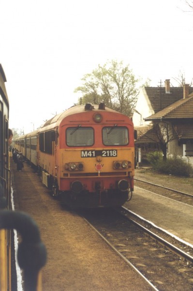 Még a villamosítás előtt, 1998-ból származó felvételen két M41-es vontatta személyvonat találkozik Őrbottyán állomáson (fotó: Jákli Imre)