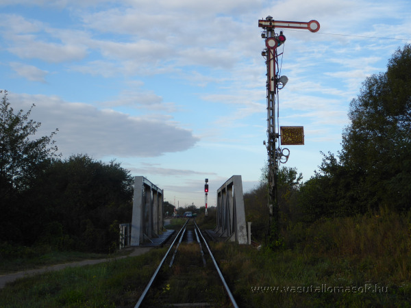 A használaton kívüli, érvénytelenített alak bejárati jelző Holdea felől, háttérben a híd után az új bejárati jelző.
