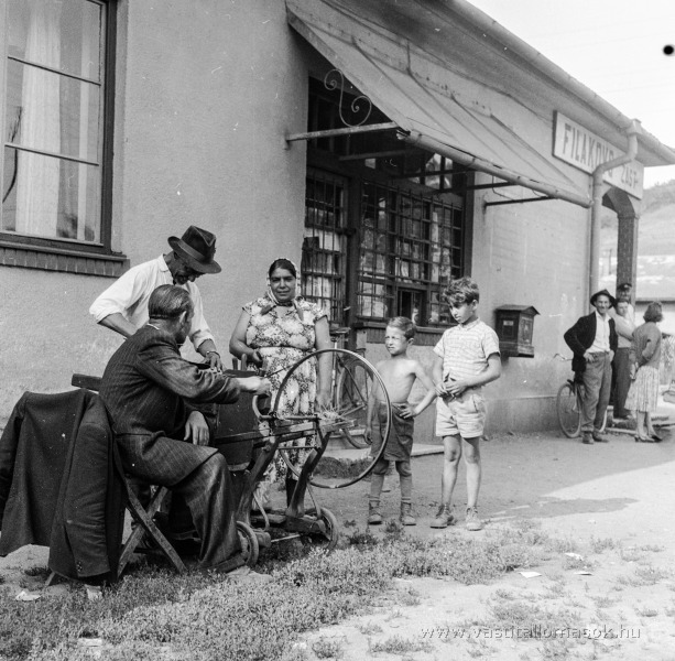 Köszörűs dolgozik Filakovo zastavka (Fülek-gyártelep) megállóhelyen.