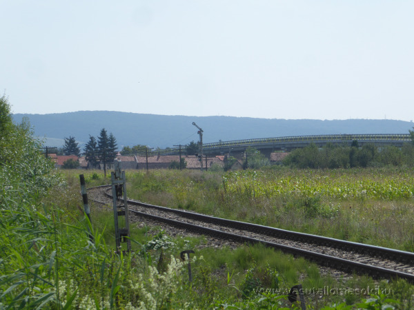 A pálya folytatása Marosvásárhely északi felé. A bejrati jelző hátterében egy közúti felüljáró látható.