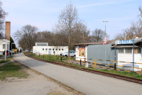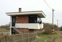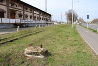 Kőbánya-Kispest vasútállomás, mellette a sorompó a Vasgyár utca végén a szintbeli keresztezésnél, 1976