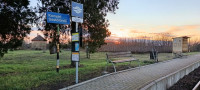Itt megvan a kék tábla, a felvételi épület oldalsó ablakán betekintve látható.